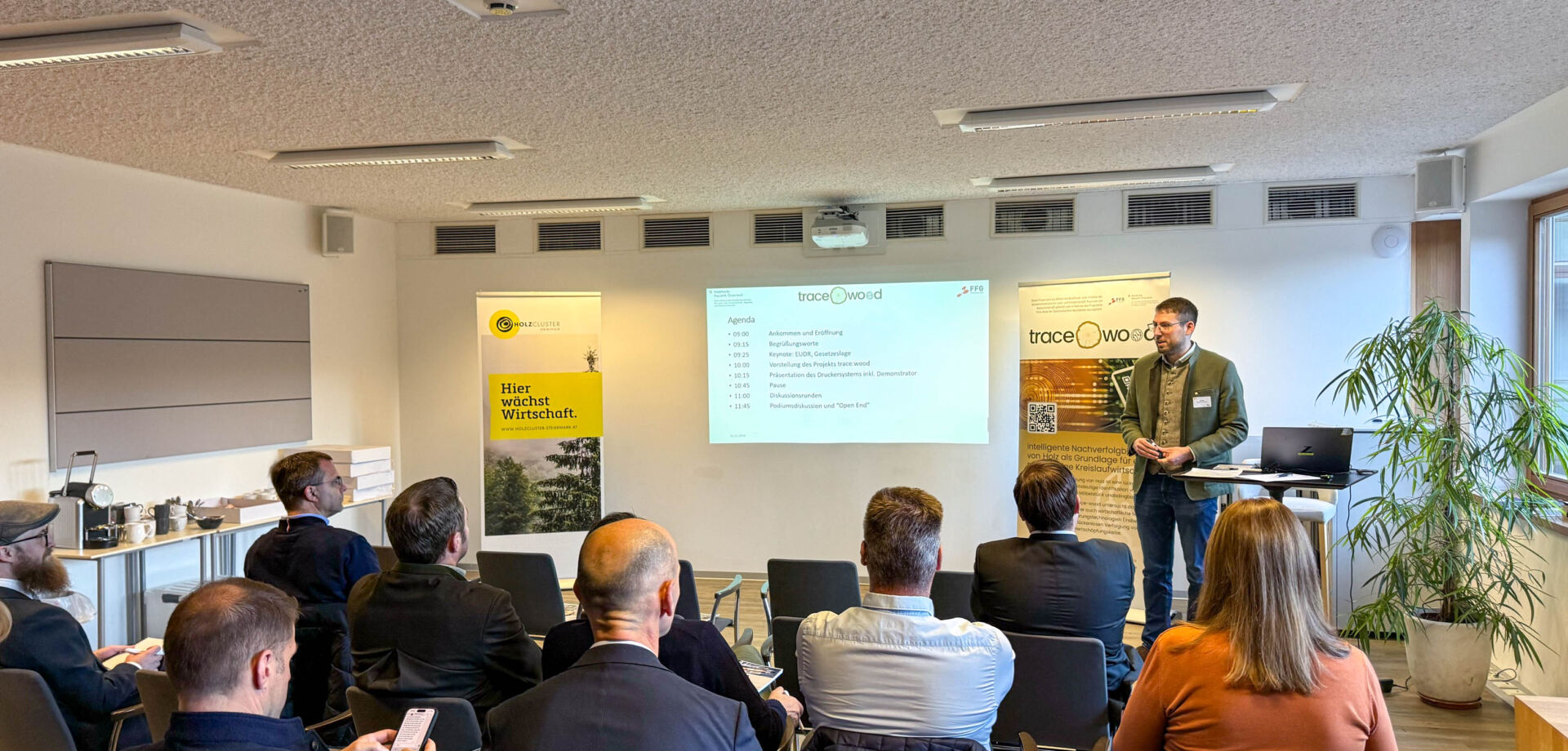 DI Dr. Martin Riegler von Wood K Plus gab Einblicke in das FFG-Projekt „trace-wood“ und den aktuellen Projektstand. Im Anschluss daran gab es eine Live-Demonstration der Druckertechnologien des Projektpartners REA Elektronik, bei der Teilnehmende sich ein Bild der Druckqualität machen und Fragen dazu stellen konnten.