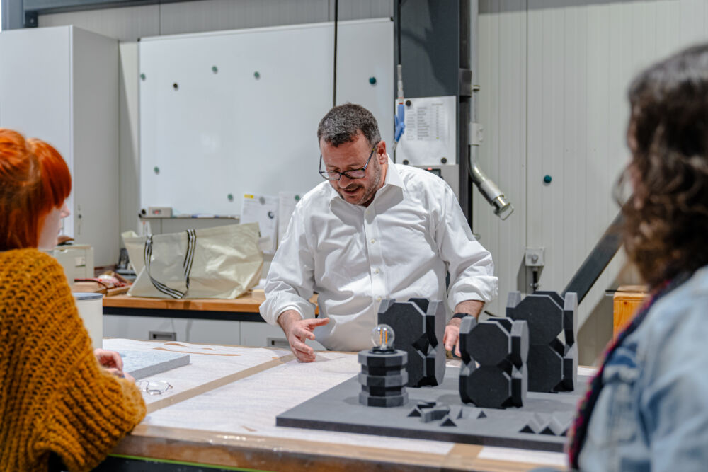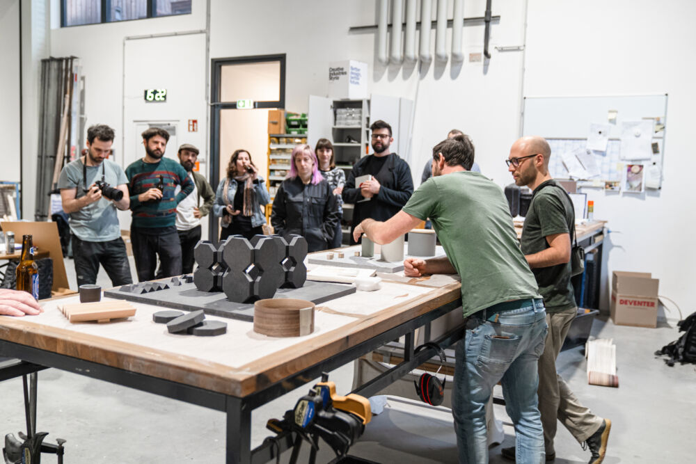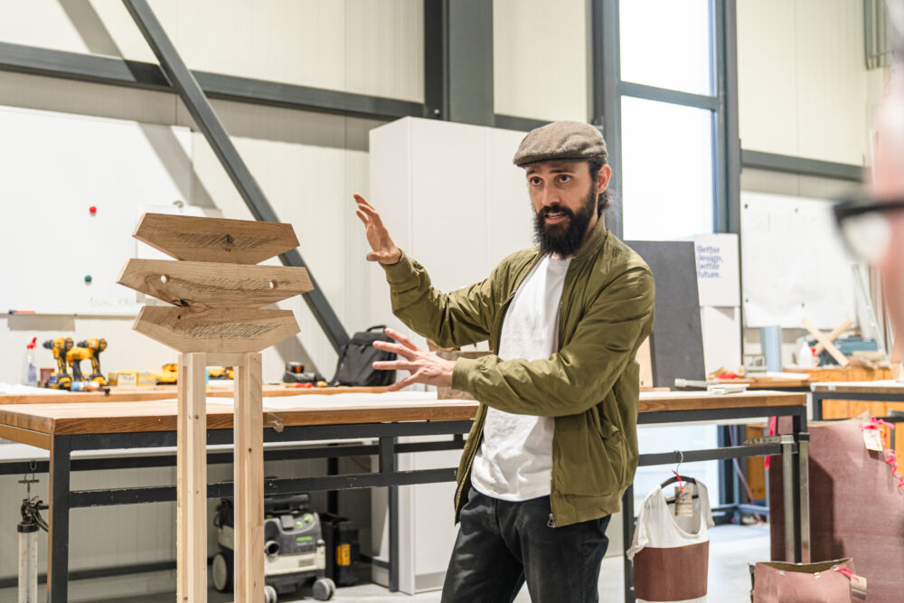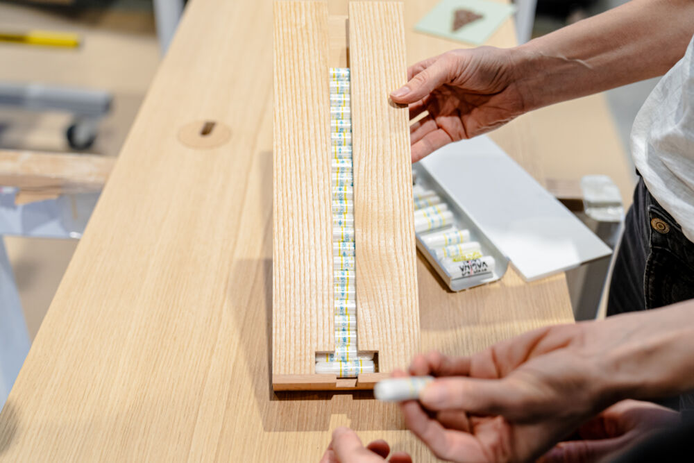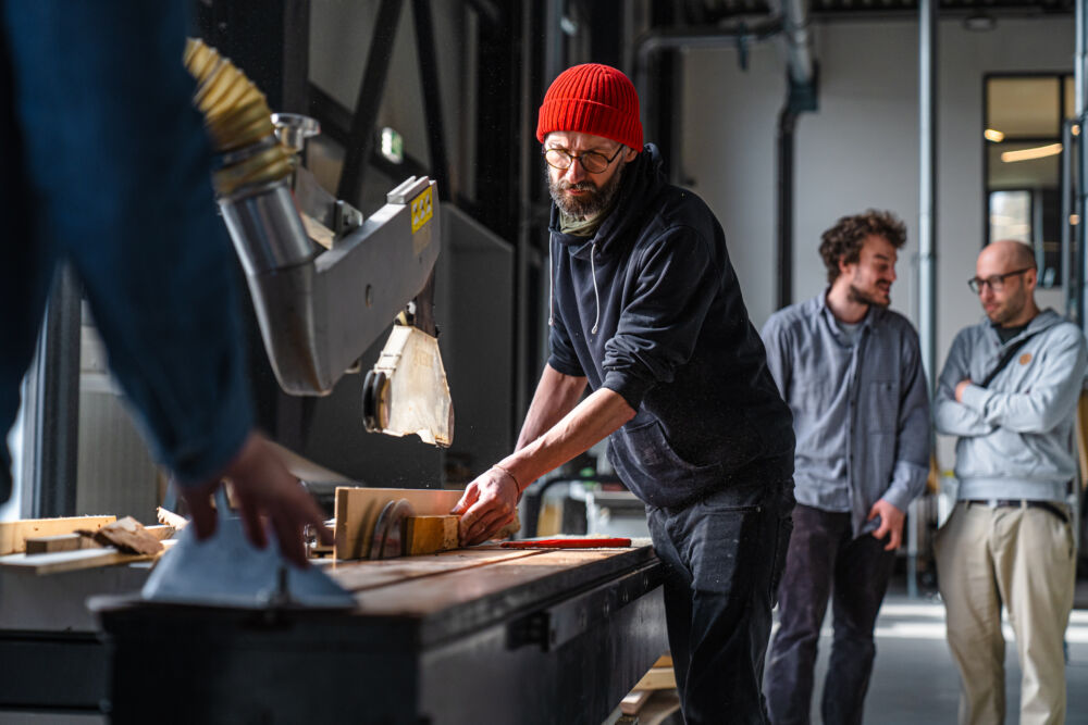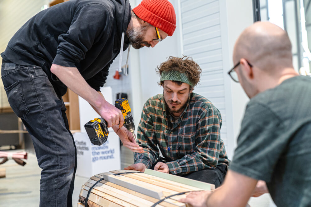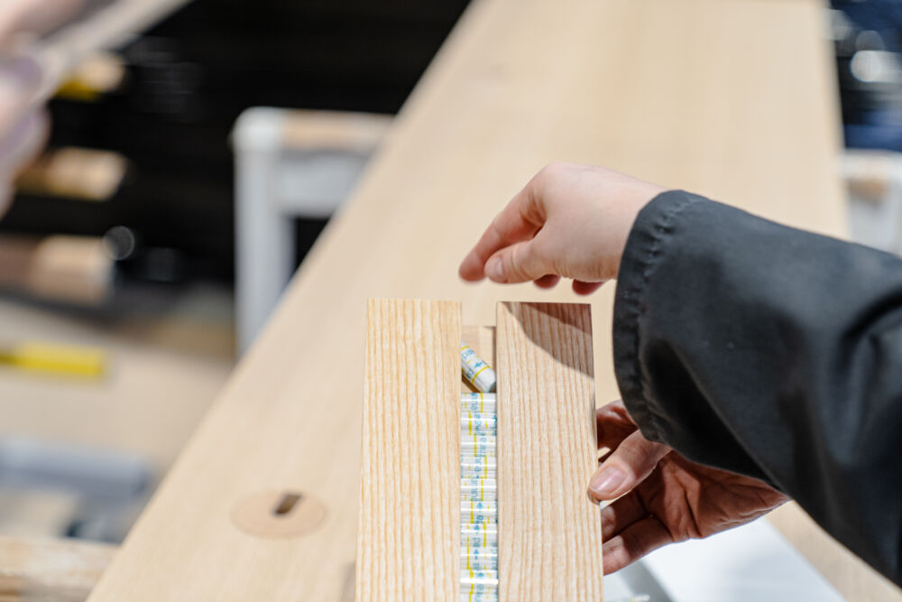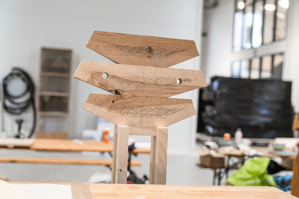 Zwischen Idee und fertigem Produkt liegt natürlich das Handwerk. In diesem Fall passierte die Umsetzung nicht hinter verschlossenen Werkstatttüren, sondern in Teamarbeit. Im zweitägigen Wood Craft Camp bei der Firma Messner landeten die Designkonzepte dafür auf der Werkbank. Die Designer:innen und Tischler:innen fertigten gemeinsam die ersten Prototypen an. Mehr als 20 Produkte sind bereit, in der Praxis zum Einsatz zu kommen. Im Designmonat Graz stellt sich das Wood Craft Design im Rahmen einer Ausstellung im Designforum Steiermark vor und einige der neuentwickelten Produkte werden zum Verkauf angeboten.